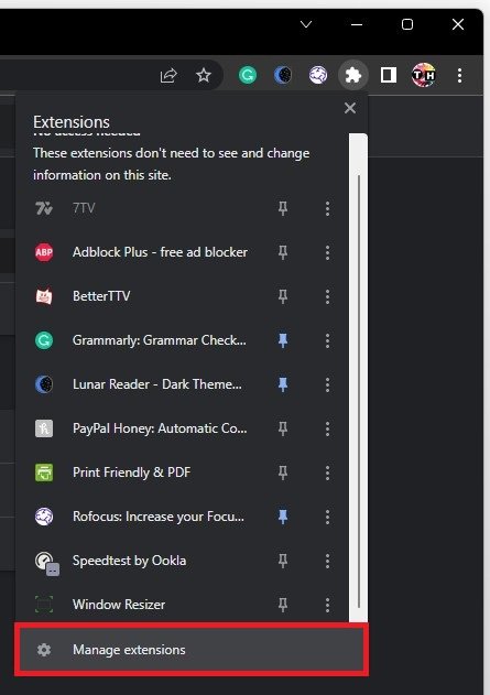 Quando isso for feito, clique no ícone da extensão e selecioneGerenciar extensões.
