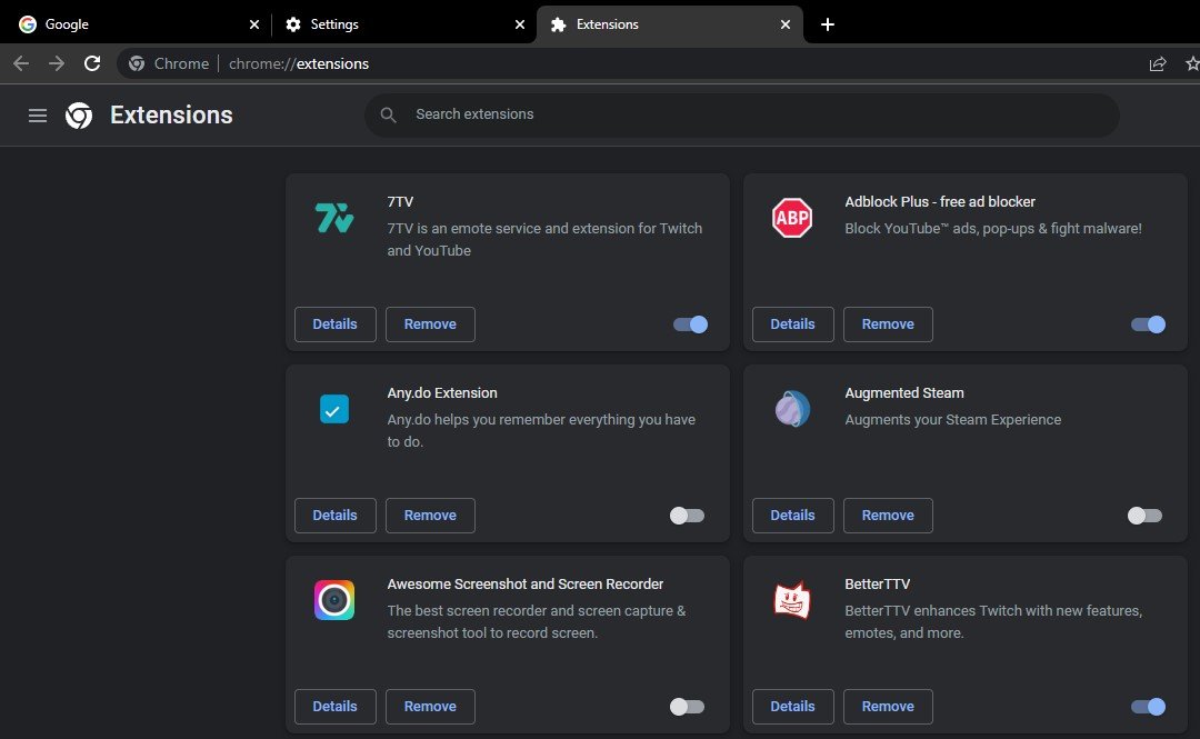 Você deverá ver uma lista de extensões aqui, algumas das quais podem causar travamentos ou problemas de inicialização. Sugiro desabilitar todas as extensões, por enquanto, para ver qual delas está causando o problema. Você pode reativá-los um por um enquanto usa seu navegador, e eu apenas me certificaria de que as extensões que você usa estejam habilitadas, pois qualquer outra extensão não utilizada pode consumir parte da sua conexão de rede ou desempenho do sistema.