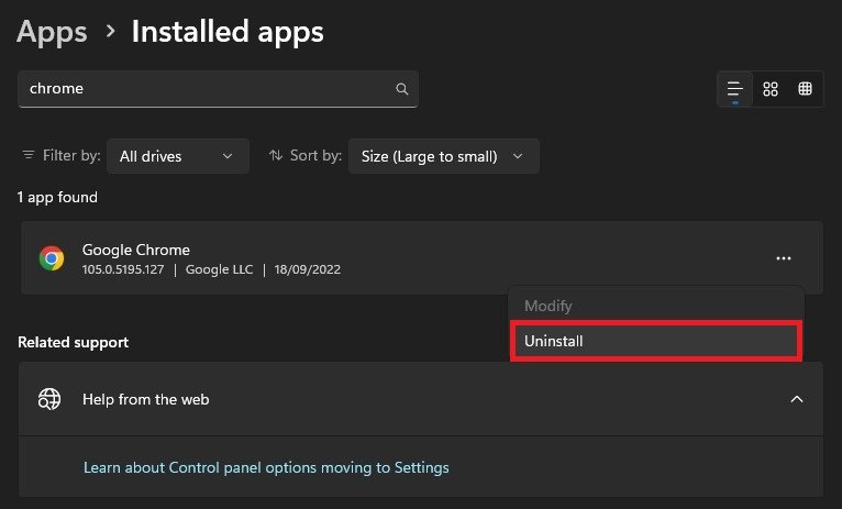 Como último recurso, você terá que reinstalar o navegador Chrome em seu sistema, pois alguns arquivos podem estar corrompidos. Nas configurações do Windows, navegue até oAplicativosseção. SobAplicativos instalados, procure por Chrome. Talvez seja necessário filtrar sua pesquisa por todas as unidades se não conseguir encontrar o aplicativo Google Chrome.