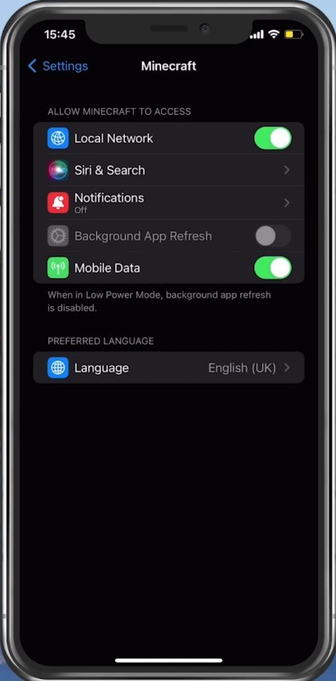 Configurações do iPhone > Minecraft > Dados móveis