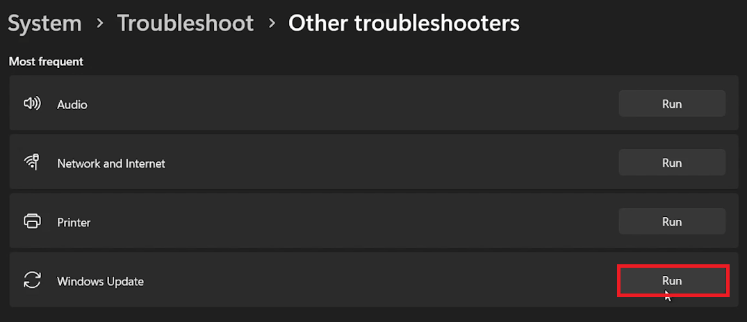 Aqui, selecione e execute a ‘solução de problemas do Windows Update’.