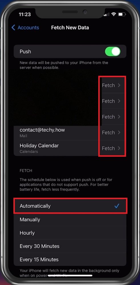 SobBuscar novos dados, certifique-se de queBuscaré usado como sua programação de dados. Isso garantirá que seus e-mails cheguem o mais rápido possível. Defina oBuscar cronogramaparaAutomaticamenteabaixo.