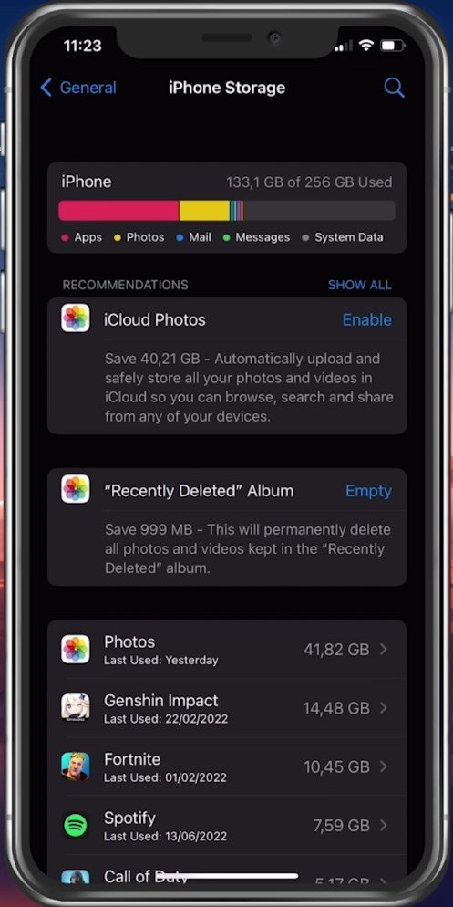 Configurações do iPhone > Geral > Armazenamento do iPhone