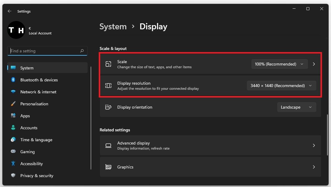 Certifique-se de que a escala esteja definida para100%e que você está usando uma resolução nativa normal. Nas configurações gráficas do jogo, defina o modo de janela paraTela cheia.