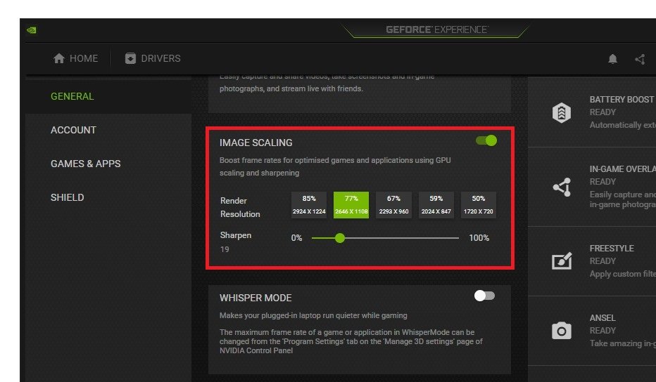 GeForce Experience > Configurações gerais > Dimensionamento de imagem