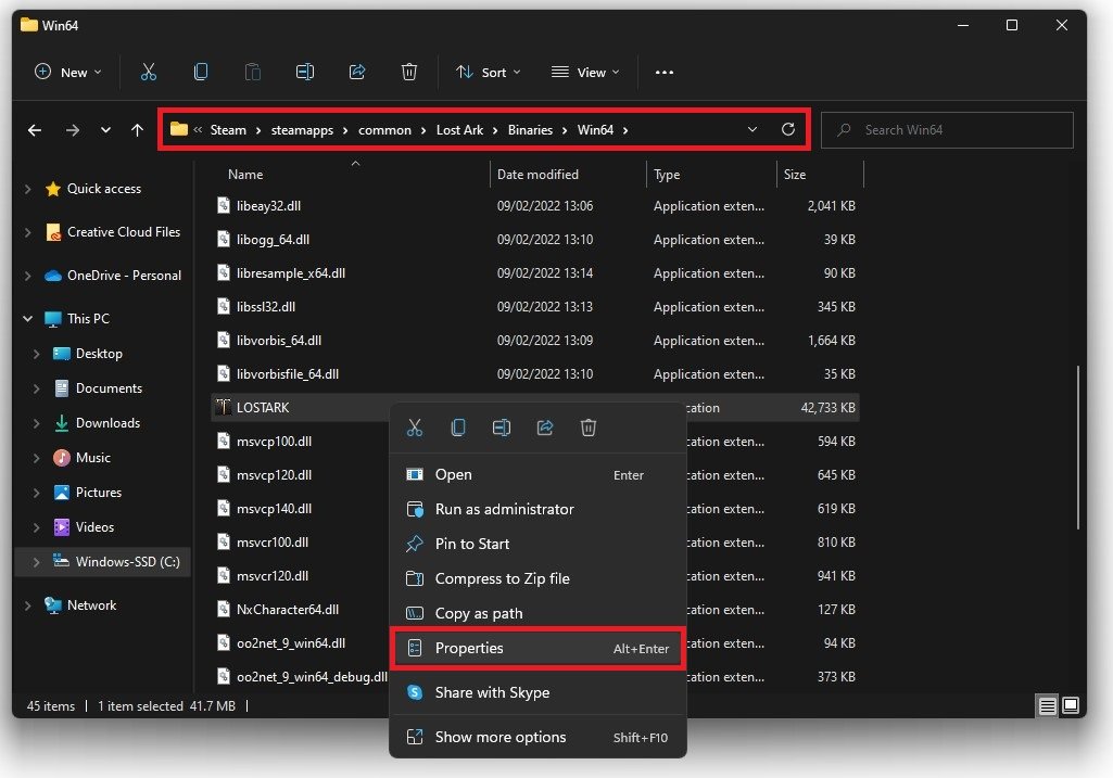Abra o seuExplorador de arquivose navegue até a unidade em que você salvou o jogoArquivos de programas>Vapor>aplicativos Steam>comum>Arca Perdida>Binários>Win64. Clique com o botão direito no aplicativo LOSTARK.exe e vá para seuPropriedades.