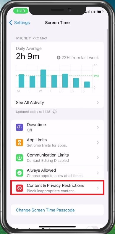 Em seuTempo de telaconfigurações, selecioneRestrições de conteúdo e privacidade. Se você estiver usando restrições de conteúdo e privacidade, certifique-se de que oGravação de telaopção está definida comoPermitir.
