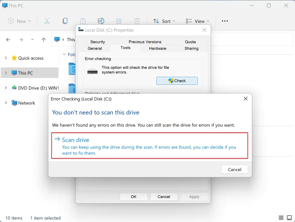 Se o tamanho da paginação não fosse o problema, provavelmente haveria erros no disco rígido. Aqui estão as etapas para verificar os erros do disco rígido: