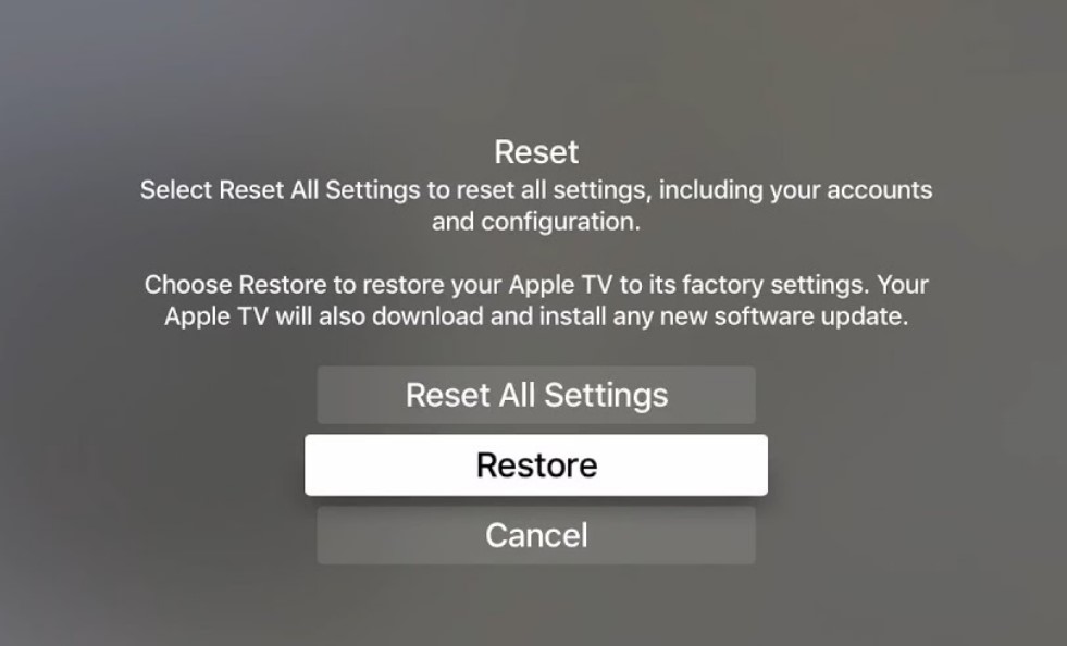 Se nenhum dos métodos funcionar e o Zoom AirPlay ainda não funcionar, você precisareiniciarseu dispositivo Apple TV para as configurações de fábrica. Vá paraConfigurações→Sistema→Reiniciar. Fazer isso redefinirá o dispositivo e apagará os dados completamente. Configure a Apple TV do zero e o AirPlay Zoom na Apple TV.