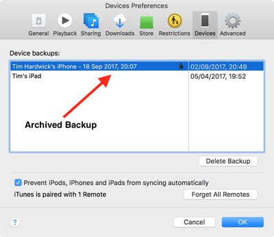 - Para arquivar o backup, selecionePreferênciasno menu do iTunes e clique no botãoDispositivosguia. Clique com o botão direito no novo backup e escolha oArquivoopção.
