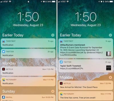 Visualizar notificações ocultadas (esquerda) e mostradas depois que o iPhone for desbloqueado (direita)