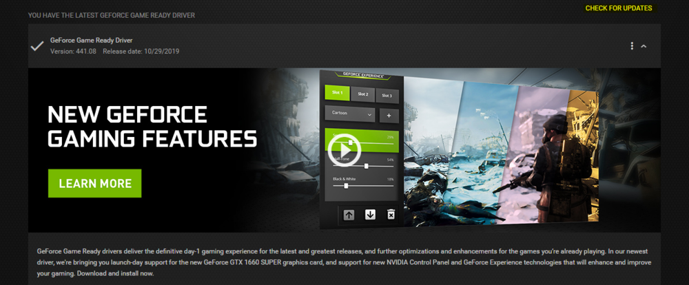 Abra o aplicativo GeForce Experience (se você usar uma placa gráfica NVIDIA) para atualizar o driver. Na seção Driver, selecione Verificar atualizações ou baixe e instale o driver mais recente diretamente.