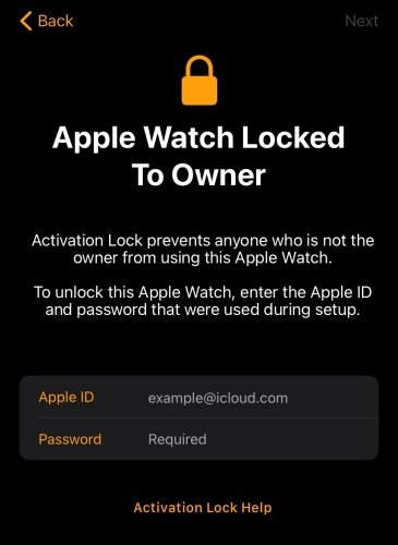 UM:Inserir diretamente seu ID Apple e senha na tela Apple Watch bloqueado para proprietário não causará perda de dados. Depois de inserir a senha, você pode remover o bloqueio de ativação do seu Apple Watch.