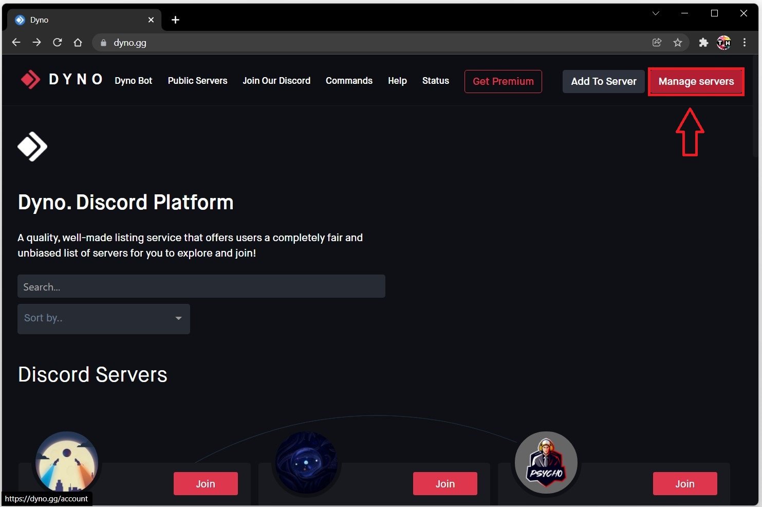 Em seguida, navegue de volta ao site da Dyno e selecioneGerenciar servidores. Você verá então uma lista de servidores aos quais ingressou, selecione aquele que você está gerenciando e onde você tem permissões de administrador.