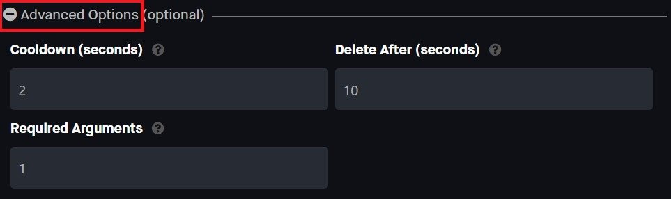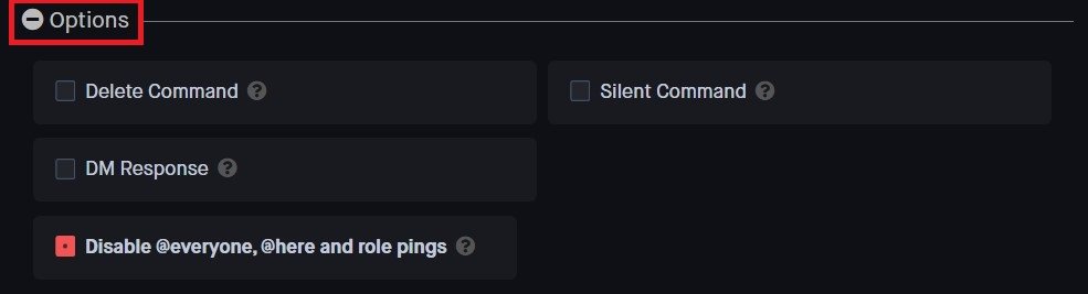 Em seuOpções de comando personalizadas, você tem a opção de o bot excluir automaticamente seu comando após escrevê-lo. Você também pode enviar a resposta do bot como uma mensagem direta ao usuário que escreveu o comando.