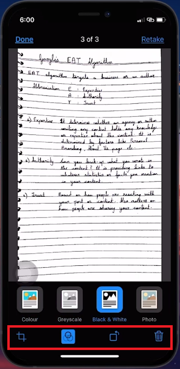 Salvando sua digitalização:Quando estiver satisfeito, toque em ‘Concluído’. Em seguida, pressione ‘Salvar’ e escolha um local no aplicativo Arquivos para armazenar seu documento. Você também pode renomear o documento para facilitar a identificação posterior.