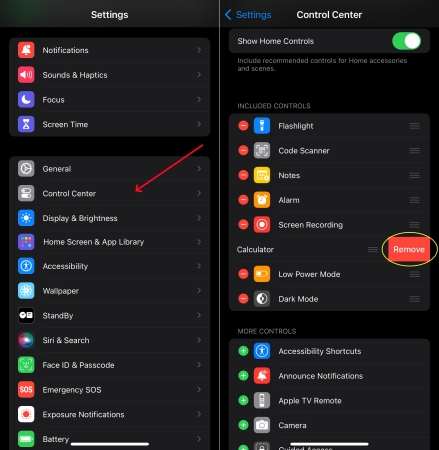Etapa 2.Role para baixo atéControles incluídose toque no ícone de exclusão ao lado de Calculadora.
