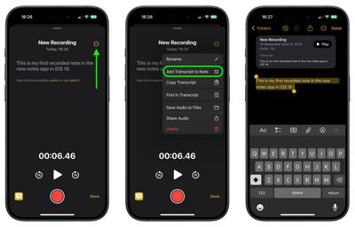 - Para adicionar a transcrição completa à nota, toque no menu de três pontos no canto superior direito.