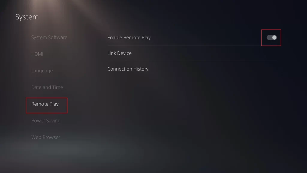 - Na tela inicial, clique emConfigurações→Sistema→Jogo Remoto→ LigarHabilitar jogo remoto.