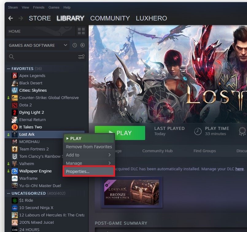 Certifique-se de que os arquivos do jogo Lost Ark estejam completos e atualizados. Abra o seuVaporbiblioteca. Clique com o botão direito em Arca Perdida e selecionePropriedades.