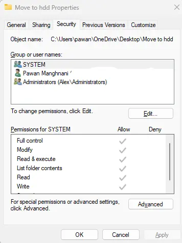 7. Na janela Permissões para [Arquivo/Pasta], você verá uma lista de usuários e grupos com acesso.