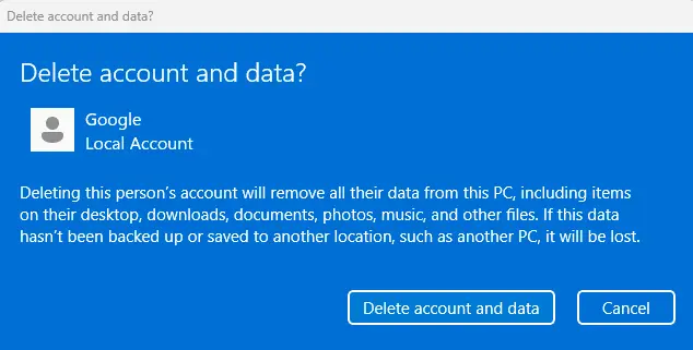 Importante :Esta ação excluirá permanentemente todos os arquivos associados a essa conta, incluindo aqueles nas pastas Documentos, Imagens e Música. Certifique-se de fazer backup de todos os dados importantes antes de continuar.