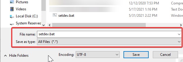 3) No canto superior esquerdo do arquivo do Bloco de Notas, clique em “Arquivo" então "Salvar como,”Para salvar o documento comosetdev.bat.