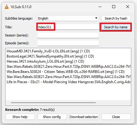 Selecione oLegenda’idiomae título do vídeo e, em seguida, você pode procurar legendas públicas que correspondam ao título do filme ou vídeo. Após selecionar o arquivo correto, clique emSeleção de download, que adicionará automaticamente a faixa de legenda ao seu vídeo.