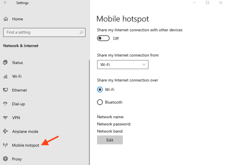 - Na barra lateral esquerda, selecione “Ponto de acesso móvel.”