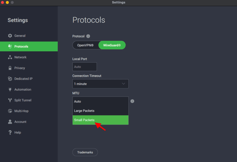 - Do “Protocolo WireGuard", clique no menu suspenso em"PESSOA”E selecione“Pacotes Pequenos.” Isso ajuda a otimizar sua conexão e reduzir o ping para que você possa navegar no Kings Canyon com latência mínima.