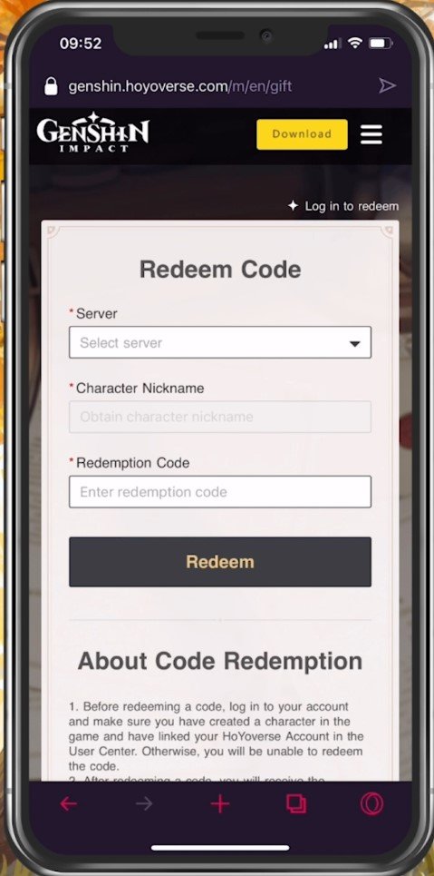 Para alguns usuários, issoResgatar códigoopção não está disponível. Você deve resgatar os códigos usando seu navegador favorito se esta opção não estiver disponível. Navegue atégenshin.hoyoverse.com. Selecione seu atualLocalização do servidor, digite o corretoApelido do personagem,e depois entre noCódigo de resgate. Para garantir que a conta correta receba os itens, você também deve certificar-se de estar conectado com sua conta Genshin Impact.