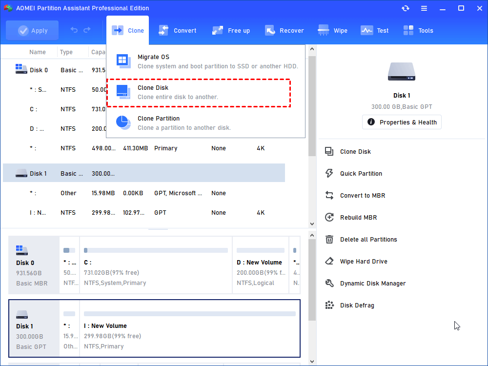 Passo 1. Instale e abra IEMOA Partition Assistant Professional Edition. Clique em “Clone Disk” no menu à direita.