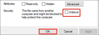 4. Marque a caixa Desbloquear e clique em Aplicar e OK. Depois, tente montar o arquivo ISO novamente.