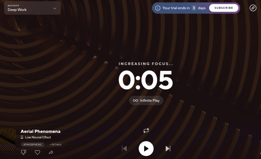 Brain.fm é umaplicativo de foco exclusivo projetado para aumentar a concentração e a produtividade por meio de músicas especialmente criadas. O aplicativo usa trilhas sonoras baseadas em neurociência que são cientificamente projetadas para ajudar os usuários a entrar em diferentes estados mentais, seja para se concentrar, relaxar ou dormir.