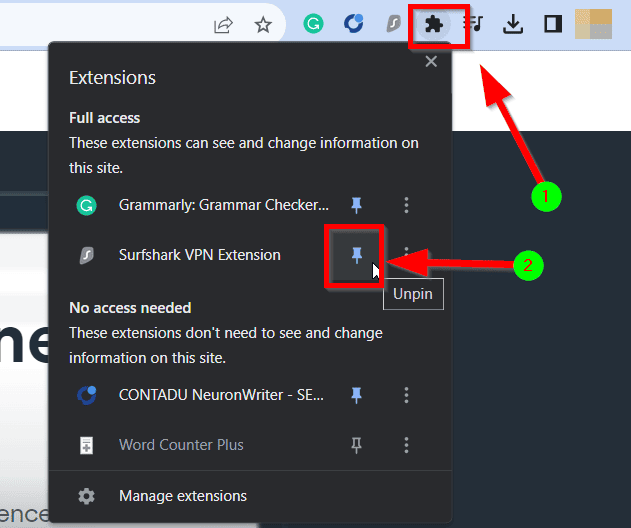- Clique no ícone de extensões e, em seguida, no alfinete próximo a “Extensão VPN Surfshark.” Dessa forma, você sempre poderá acessar facilmente a extensão.