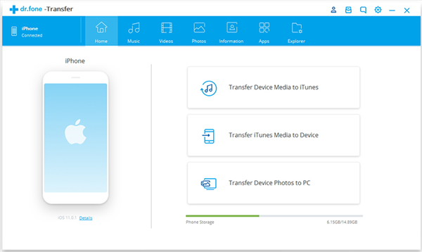 dr.fone – Transferência (iOS) é por último, mas não menos poderosa, ferramenta de transferência de dados que permite aos usuários mover SMS, vídeos, imagens e muito mais entre o iPhone e o computador. É compatível com Windows e Mac. Ele oferece uma versão de teste gratuita aos usuários e também pode transferir arquivos entre o iTunes e vários dispositivos iOS. Suporta todas as versões do iOS e modelos de iPhone. Ele também permite que os usuários transfiram o conteúdo do iPhone para o computador simplesmente arrastando e soltando.