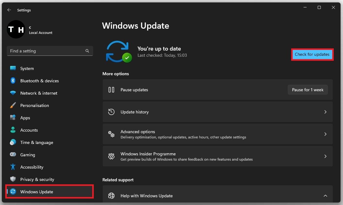 Mantenha o seuConfiguraçõesjanela aberta e procure porAtualizarpara chegar ao seuAtualização do Windowsconfigurações. Certifique-se de verificar se há atualizações recentes e, se houver uma atualização disponível para você, baixe-a antes de reiniciar o PC, que instalará a atualização para você.