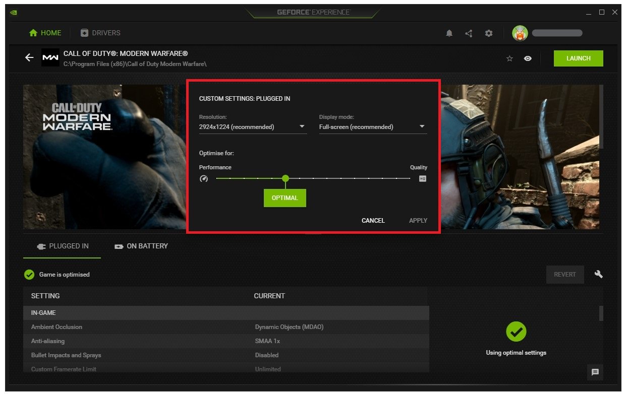 GeForce Experience > Página inicial > Modern Warfare > Detalhes