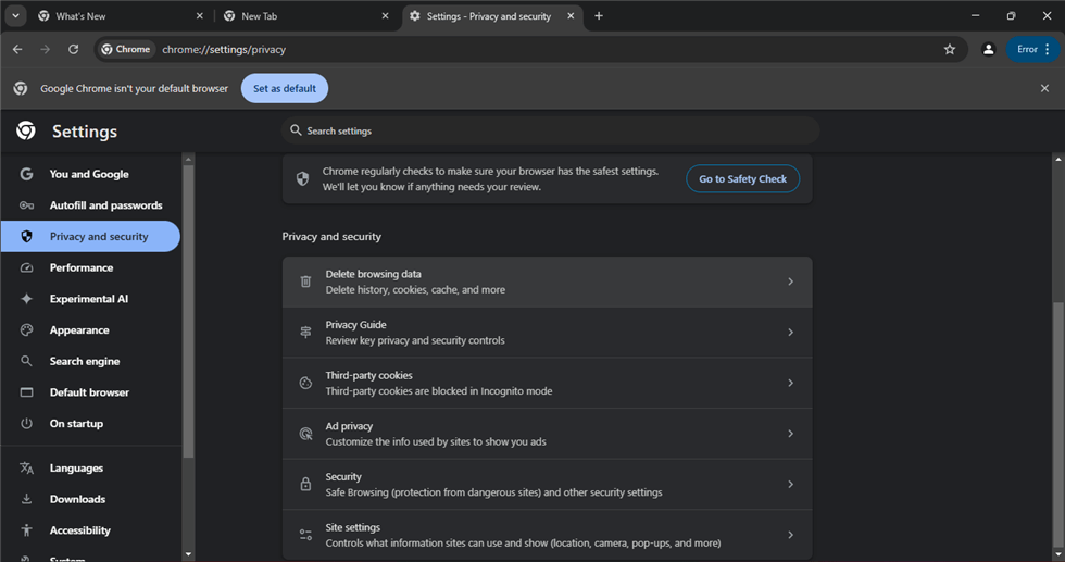 Etapa 2.Clique“Privacidade e Segurança”no menu esquerdo.