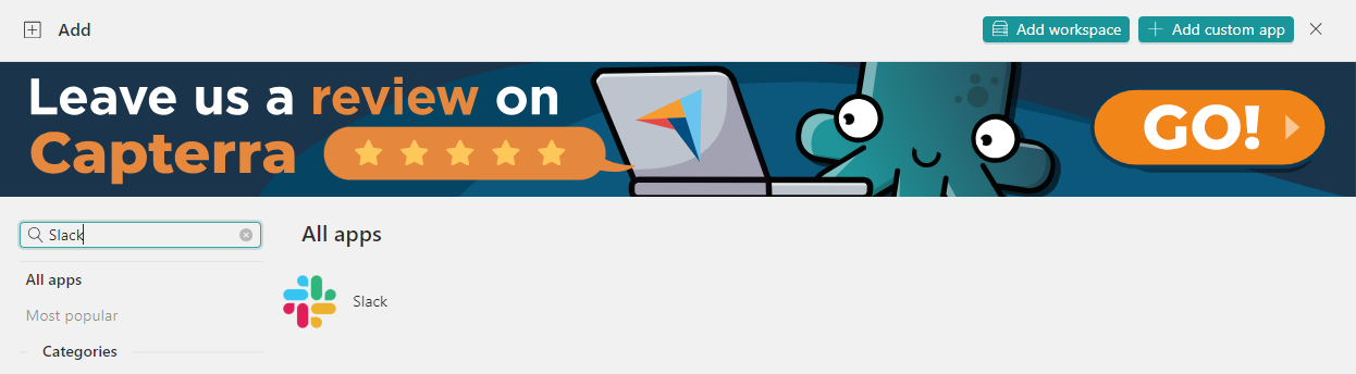 - Klicka på "+ Lägg till en app eller arbetsyta."