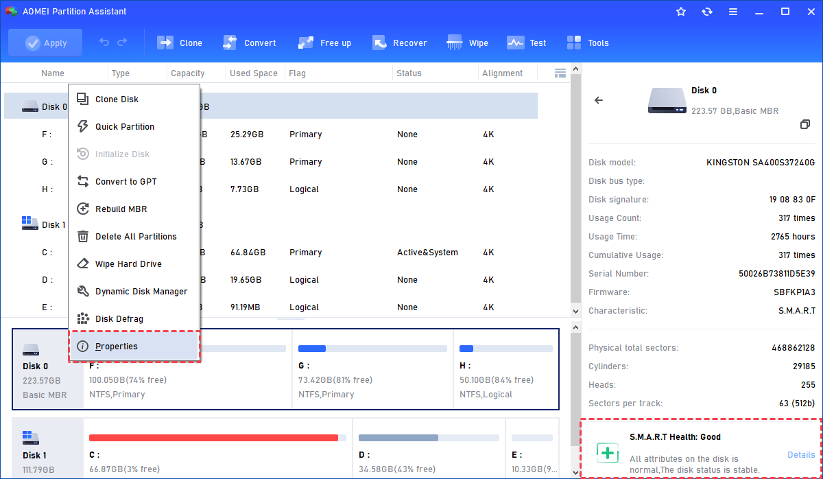 Steg 1.Installera och starta IEMOA Partition Assistant Professional. Klicka på den enhet du behöver kontrollera. Till höger om gränssnittet ser du "Egenskaper" alternativet.