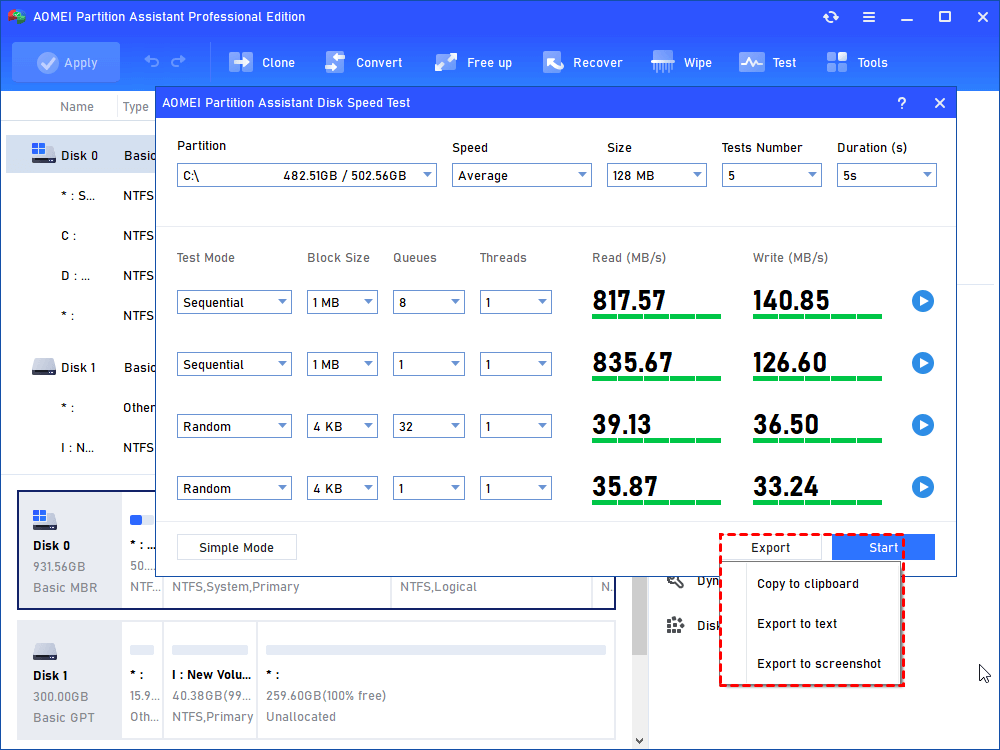 Steg 3.Efter att ha klickat på "Start”-knappen kommer du in i ett nytt gränssnitt. Här kan du ändra standardinställningarna efter dina behov: Partition, Medel/Maximal hastighet, Storlek, Testnummer och Varaktighet.