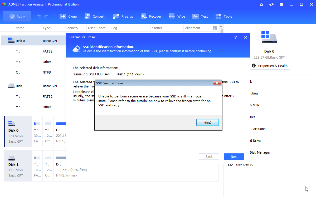 Steg 4.Om du får ett meddelande som märker att din SSD-enhet är frusen. Du kan följa handledningen för att komma ur den här situationen.