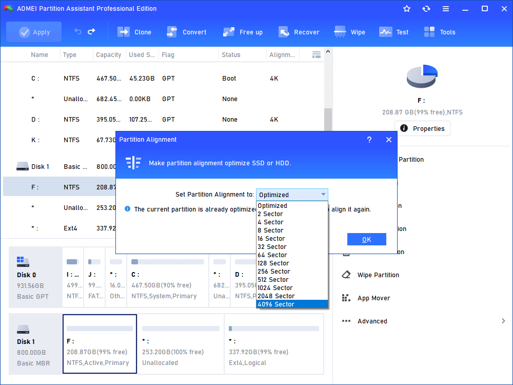 Steg 3.Du kan se en minifönster-popup. Välj en partitionssektor att justera (vänligen välj "4096 Sektor” för att uppnå 4K-justering, eller så kan du välja andra i ljuset av dina behov).
