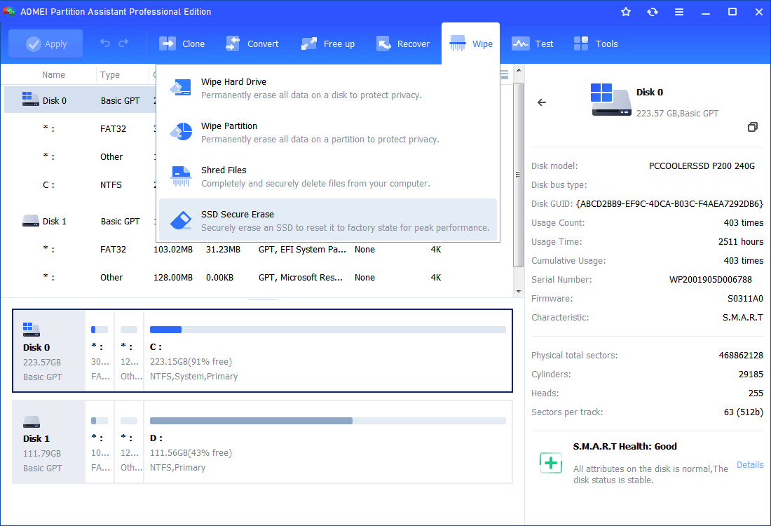 Steg 1.Starta programvaran. Klicka på SSD:n, klicka på alternativet "Torka" högst upp i gränssnittet och välj "Säker radering av SSD”.