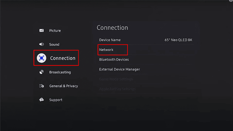 Steg 1: Gå till inställningsmenyn på din TV. Välj Allmänt > Extern anslutningshanterare.
