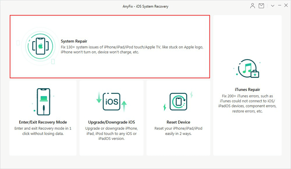 Steg 1. Starta AnyFix på din dator och välj sedanSystemreparationAlternativ. Du kan ansluta din iPad till datorn med USB-sladden / Micro-USB.