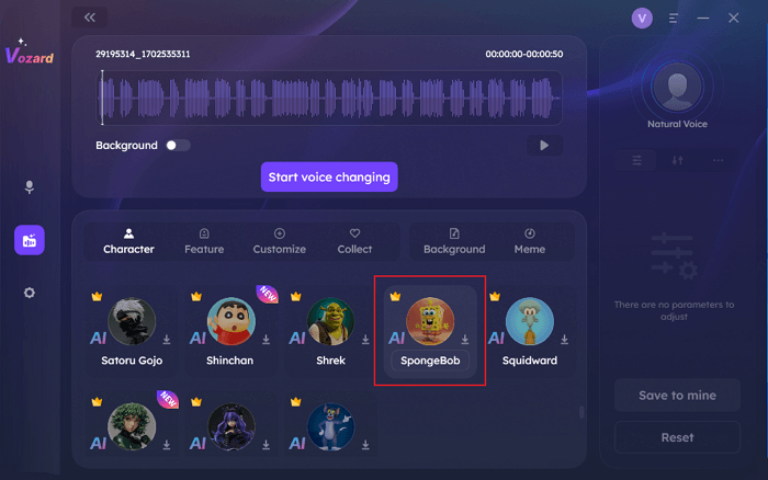Ladda ner AI Voice Changer Vozard, ställ in din mikrofon och högtalarenheter i Inställningar och gå till realtidsläge. Välj SpongeBob AI-rösteffekt från kategorin Cartoon, så kommer du att låta som Svampbob i realtid och chatta med Svampbobs röstväxlare på andra spel- och onlineprogram som Discord, Fortnite, Roblox och Twitch.