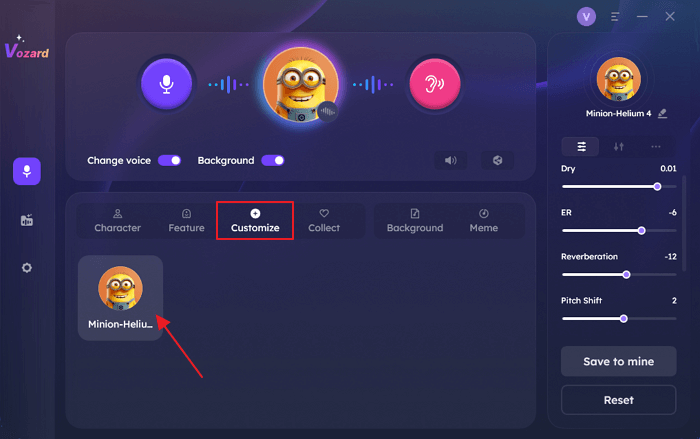Steg 4.Ändra ER till -6, efterklang till -12, Pitch Shift till 2, Throat Width till 0,57 och Pitch Length till 0,76, klicka sedan på "Spara till min" för att lägga till den här anpassade rösten på fliken Anpassa. Du kan byta namn på den till "Helium".