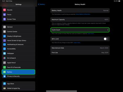 På Apples 2024 M4 iPad Pro och M2 iPad Air-modeller har Apple gjort det möjligt att kontrollera antalet slutförda battericykler, vilket är ett värdefullt mått för att bestämma enhetens batteritillstånd.